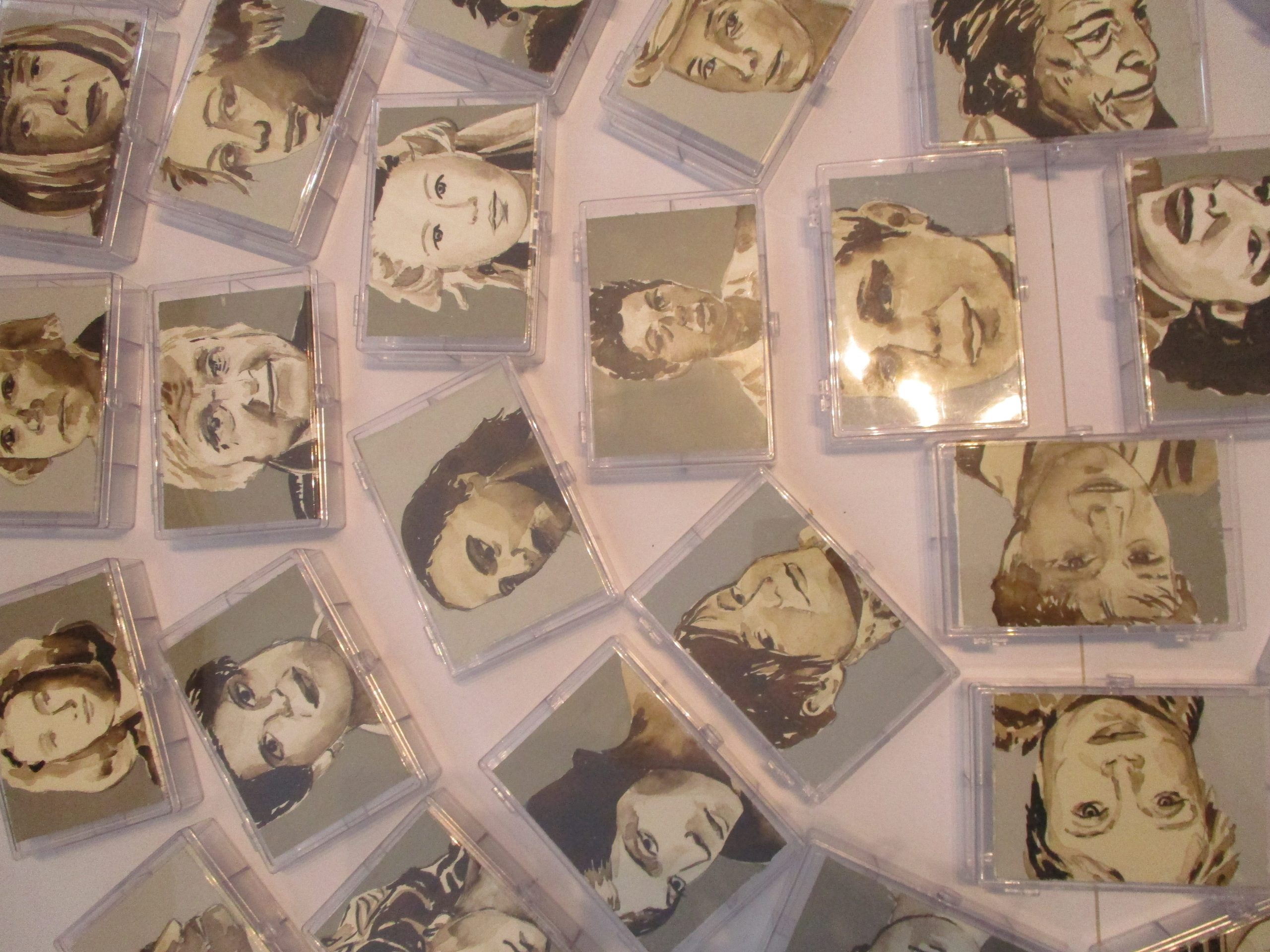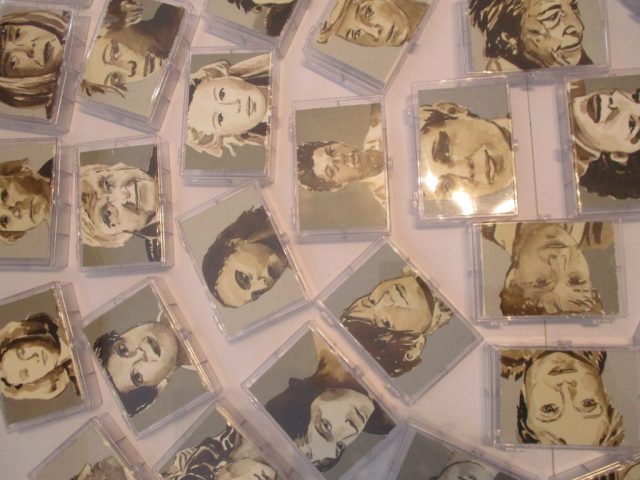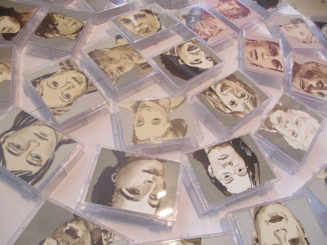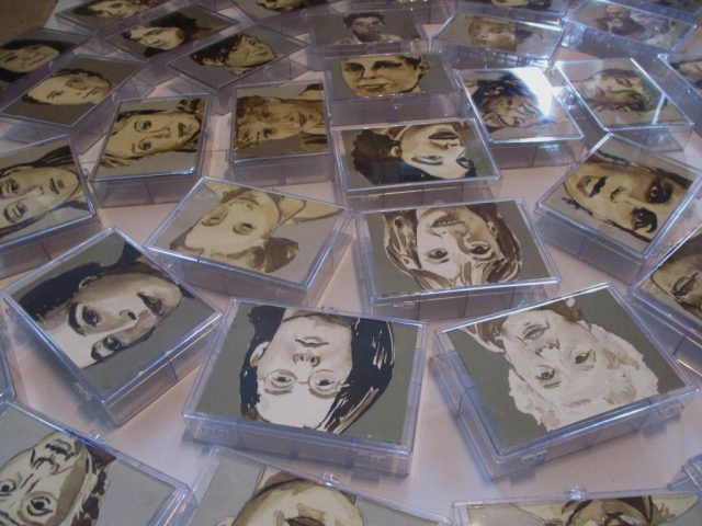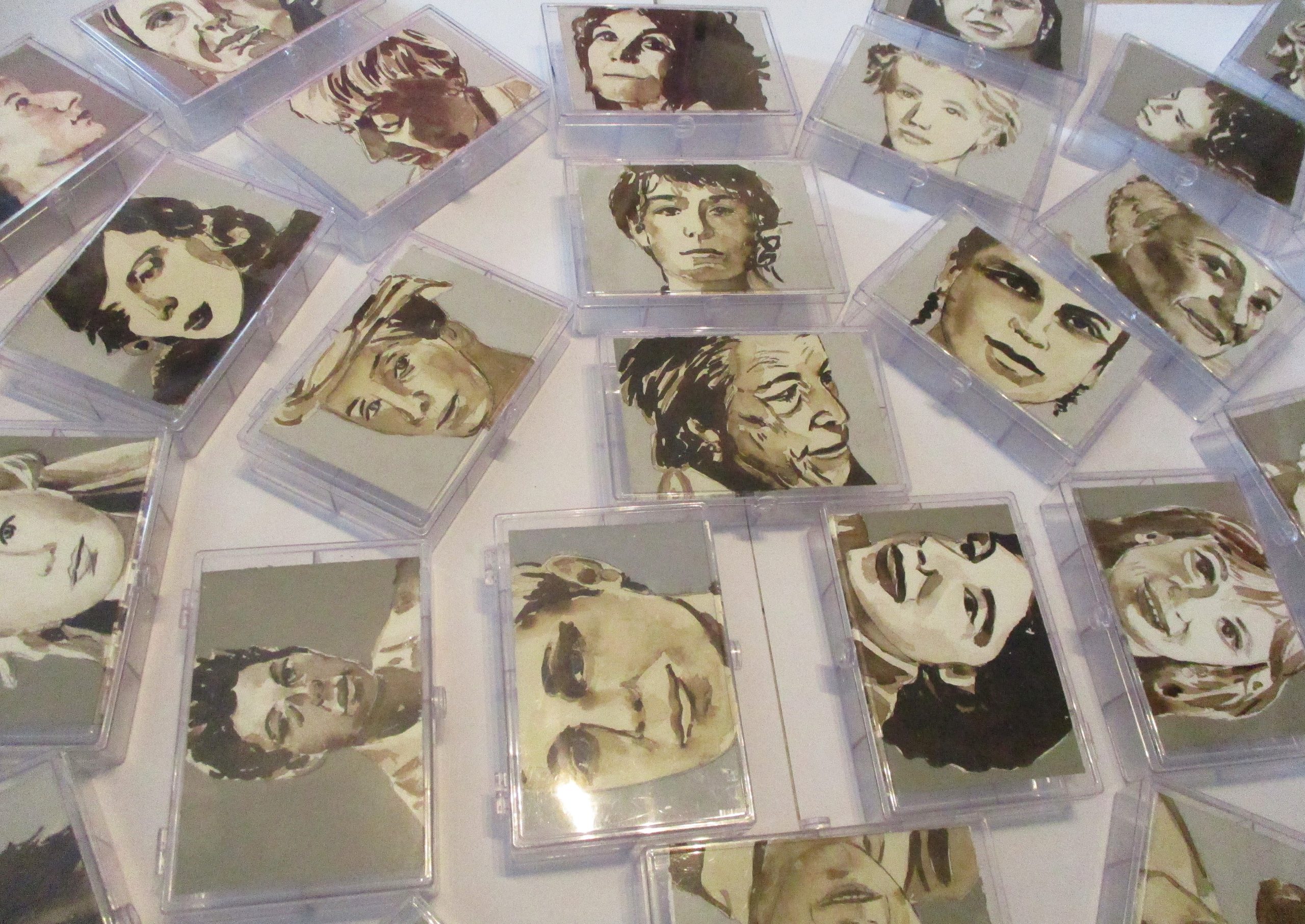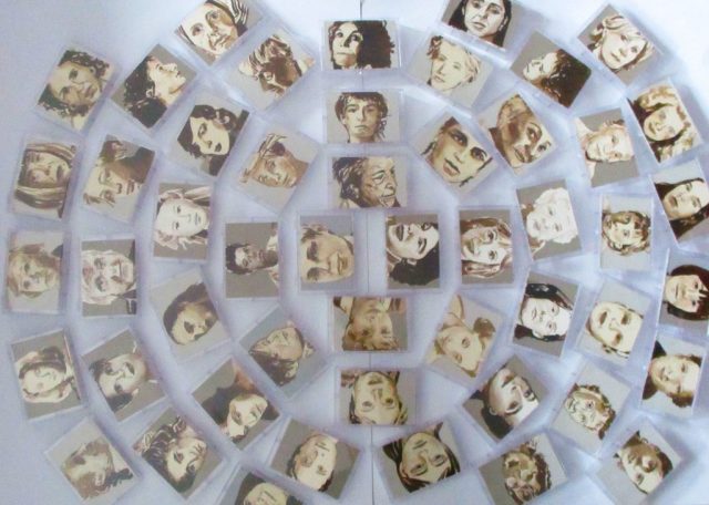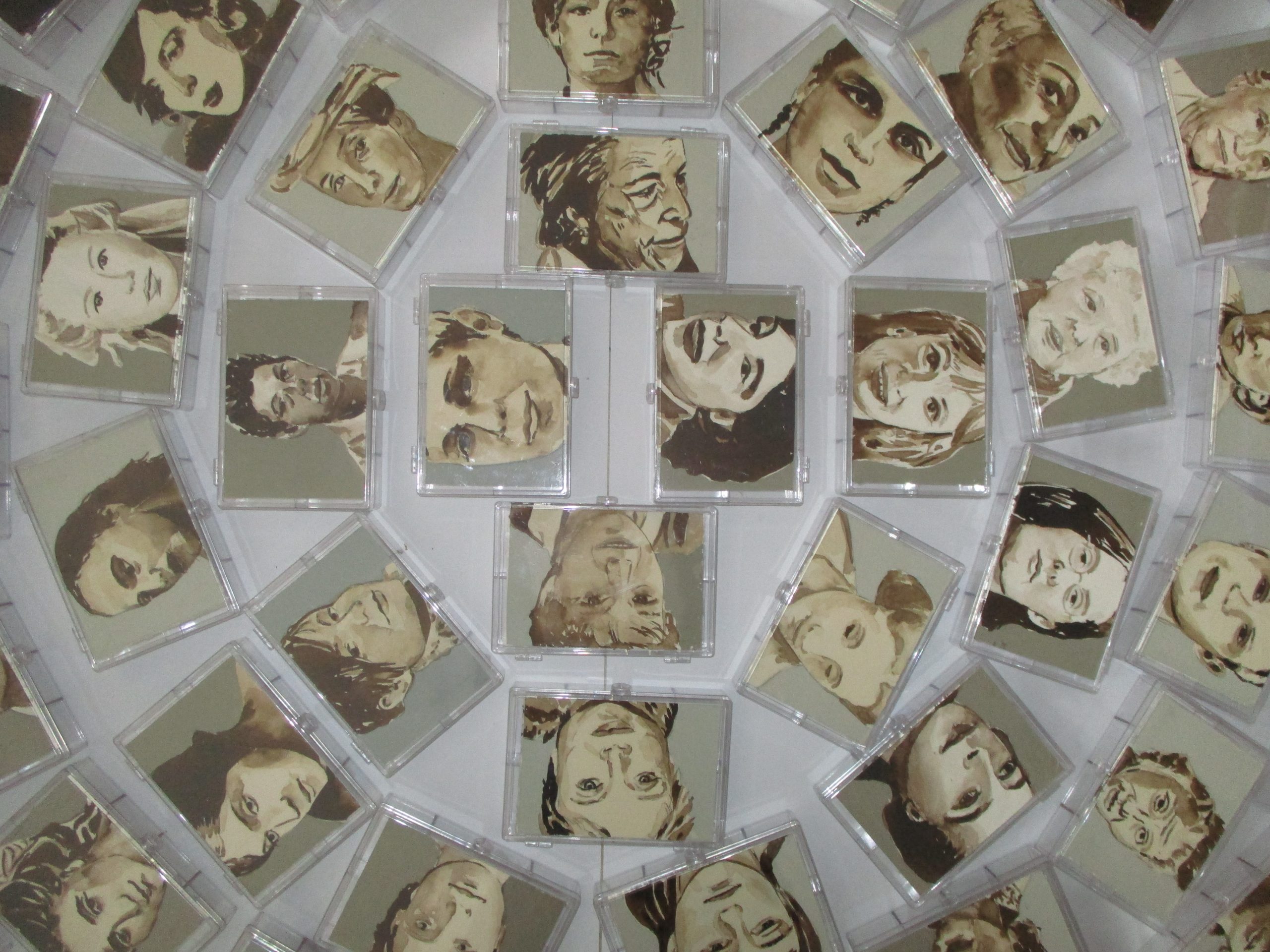 Wichtige moderne, wie zeitgenössische Künstlerinnen sind hier abgebildet. Teils habe ich sie nach bewundernder Anerkennung meinerseits ausgewählt, teils kann man, da man ja lange auf ihre Gesichter beim Ausarbeiten schauen muss, ihre Energie spüren und sich daran erinnern, dass auch sie sich trotz schwieriger Zeiten behauptet haben. Somit allen die sich mit ihrer Kunst befassen Kraft geben! Noch ist diese Arbeit in einem Zwischenstadium, da die kleinen Kästchen noch auf der Rückseite möglicherweise „gefüllt“ werden können…der Weg ist da noch offen…dies soll der „letzte“ Teil für die große Installation mit dem Titel „Goadinne“ werden. Bis heute ist es die umpfangreichste Installation zu einem Thema.